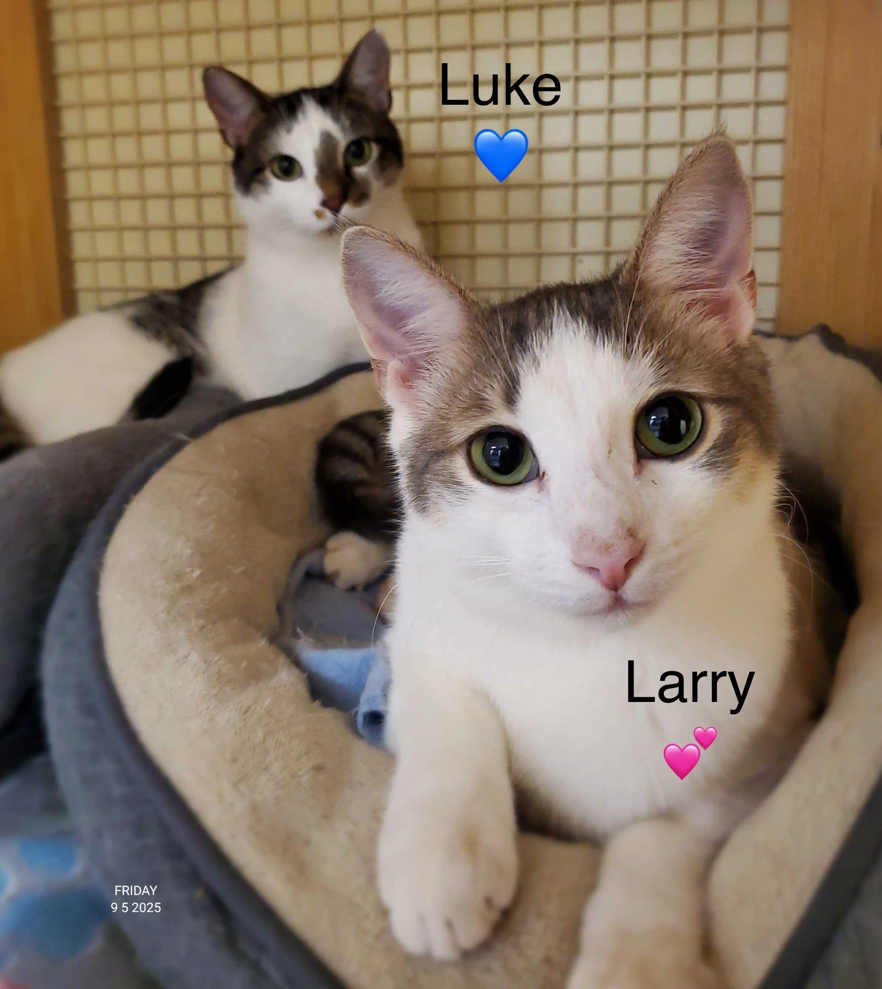 Since arriving at NCRA, they’ve slowly learned what safety feels like. Larry is the brave lovebug—he leans in for pets and purrs with his whole heart. Luke is shy at first, but once he trusts you, he melts and trills softly when touched. They’ve been each other’s comfort through every moment of fear and loss.